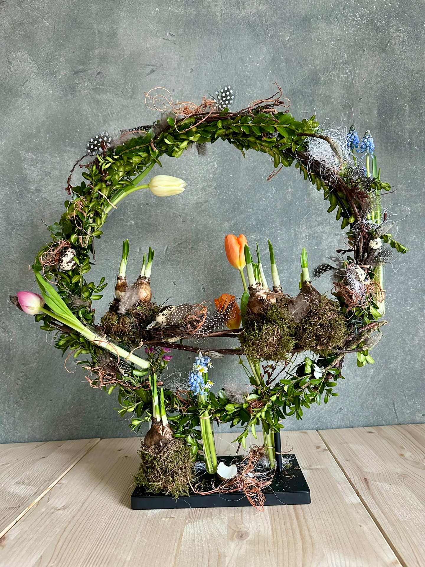 Voorjaar symboliseert nieuw leven. Het lonkt en wil gevierd worden. Tijdens deze Paasworkshop vertalen we dat gevoel naar een bijzondere, staande voorjaarskrans vol frisse kleuren, bolletjes, mos en speelse details. Een creatie die de energie van de lente letterlijk in huis haalt. Onder begeleiding maak je stap voor stap jouw eigen voorjaarskrans — een ode aan groei, aan licht en aan het nieuwe seizoen dat zich aandient. Omdat we werken met natuurlijke materialen, eigen creativiteit en beschikbaarheid, kan de krans afwijken van de getoonde afbeelding. Dit maakt elke krans uniek.
