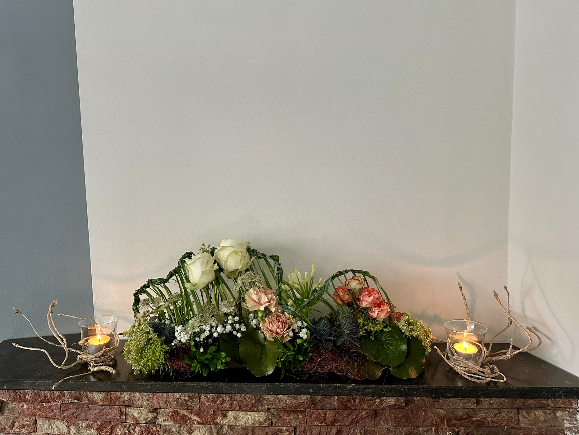 Omdat we werken met natuurlijke materialen, eigen creativiteit en beschikbaarheid, kan jouw bloemwerk afwijken van de getoonde afbeelding. Dat maakt ieder bloemig eerbetoon uniek.